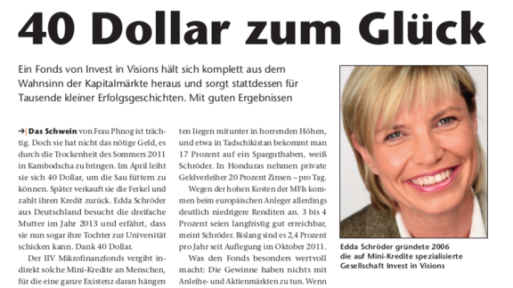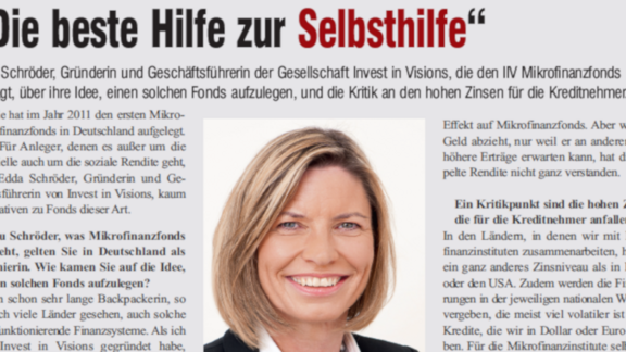 Das Unternehmen Invest in Visions mit Sitz in Frankfurt am Main hat sich auf nachhaltige Investitionen spezialisiert. Der Fokus liegt dabei auf den Entwicklungs- und Schwellenländern, in denen erfolgversprechende und nachhaltige Investitionen getätigt werden. Dabei wird größter Wert auf Transparenz und den nachhaltigen, sozialen Nutzen des investierten Kapitals gelegt. Bei der Auswahl der kooperierenden Mikrofinanzinstitute haben „weiche Faktoren“ wie Firmen-Philosophie, Mitarbeiterführung und soziale Vergabekriterien einen hohen Stellenwert. Im Oktober 2011 hat Invest in Visions den ersten deutschen Mikrofinanzfonds, aufgelegt. Seit 1994 ist die Gründerin der Invest in Visions GmbH, Edda Schröder, die sich mindestens zweimal jährlich bei den Endkreditnehmern von Ort ihr eigenes Bild verschafft, in der Asset-Management-Branche in unterschiedlichen Positionen tätig. „Schon vor meiner Tätigkeit im Finanzdienstleistungsbereich interessierte ich mich sehr stark für die Entwicklungshilfe und -zusammenarbeit. Durch Invest in Visions wurde eine perfekte Symbiose zwischen Entwicklungshilfe und der Finanzbranche geschaffen, die die Interessensverfolgung beider Bereiche ermöglicht. Denn ich bin überzeugt davon, dass Finanzprodukte nicht nur eine attraktive Rendite erzielen, sondern zudem auch eine nachhaltige Entwicklung fördern und lenken können.”